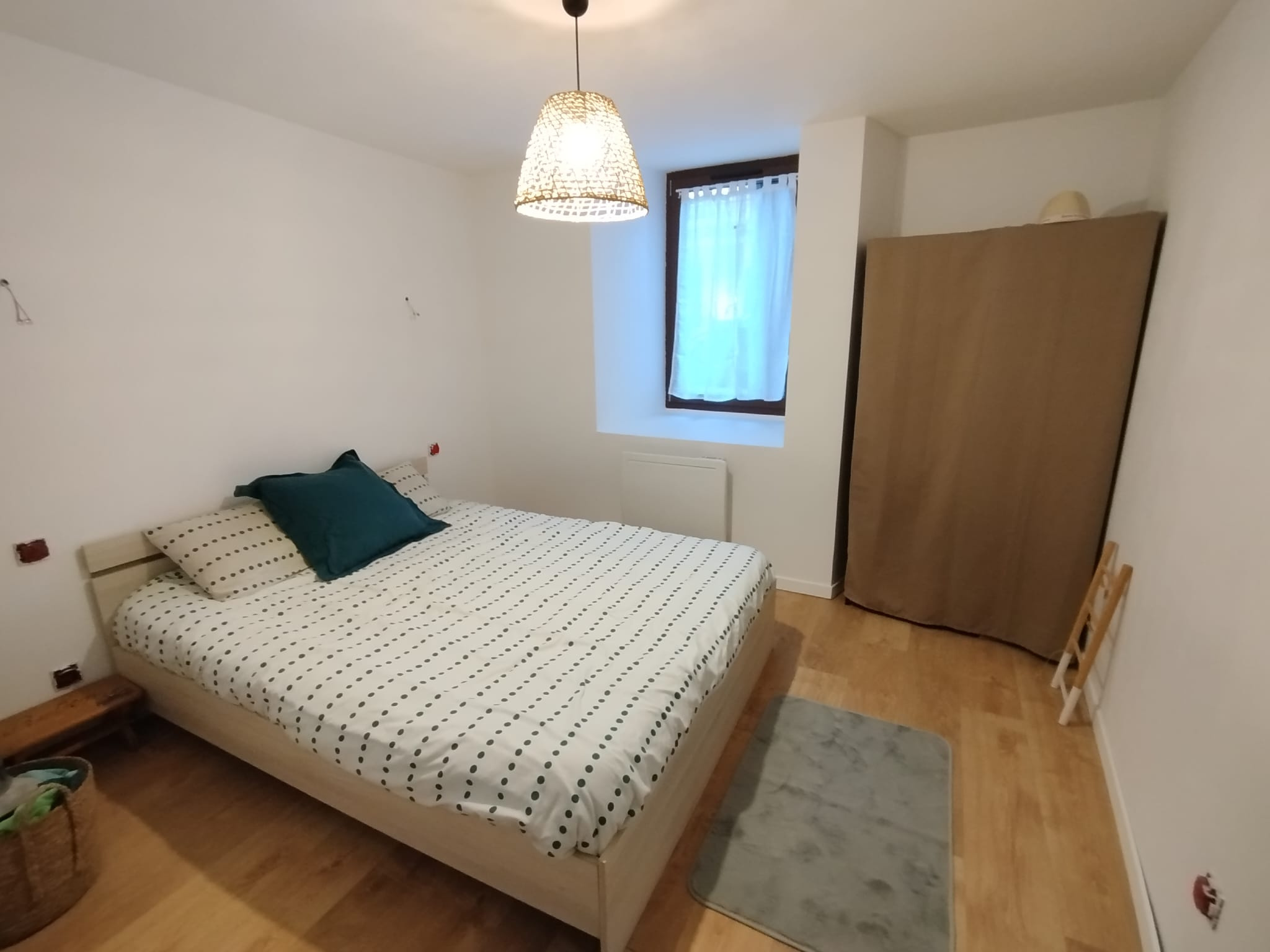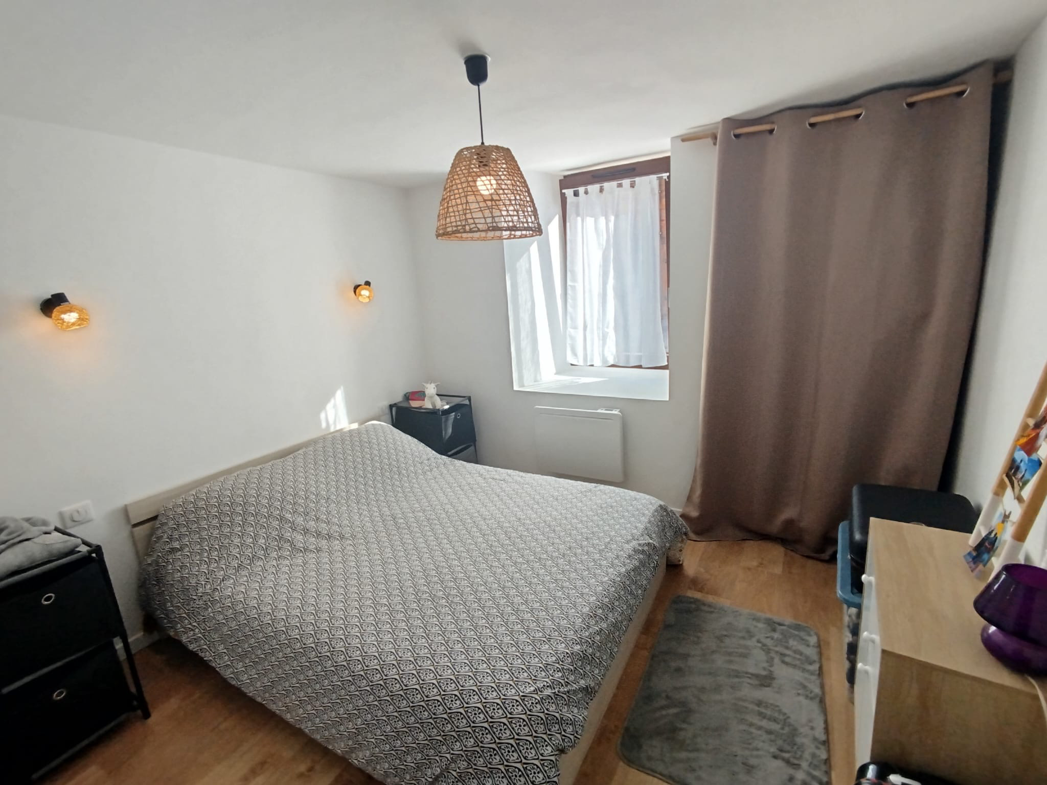 A l'étage accessible aussi par une terrasse extérieure, vue montagnes, un salon/séjour avec poèle à bois, une cuisine.
