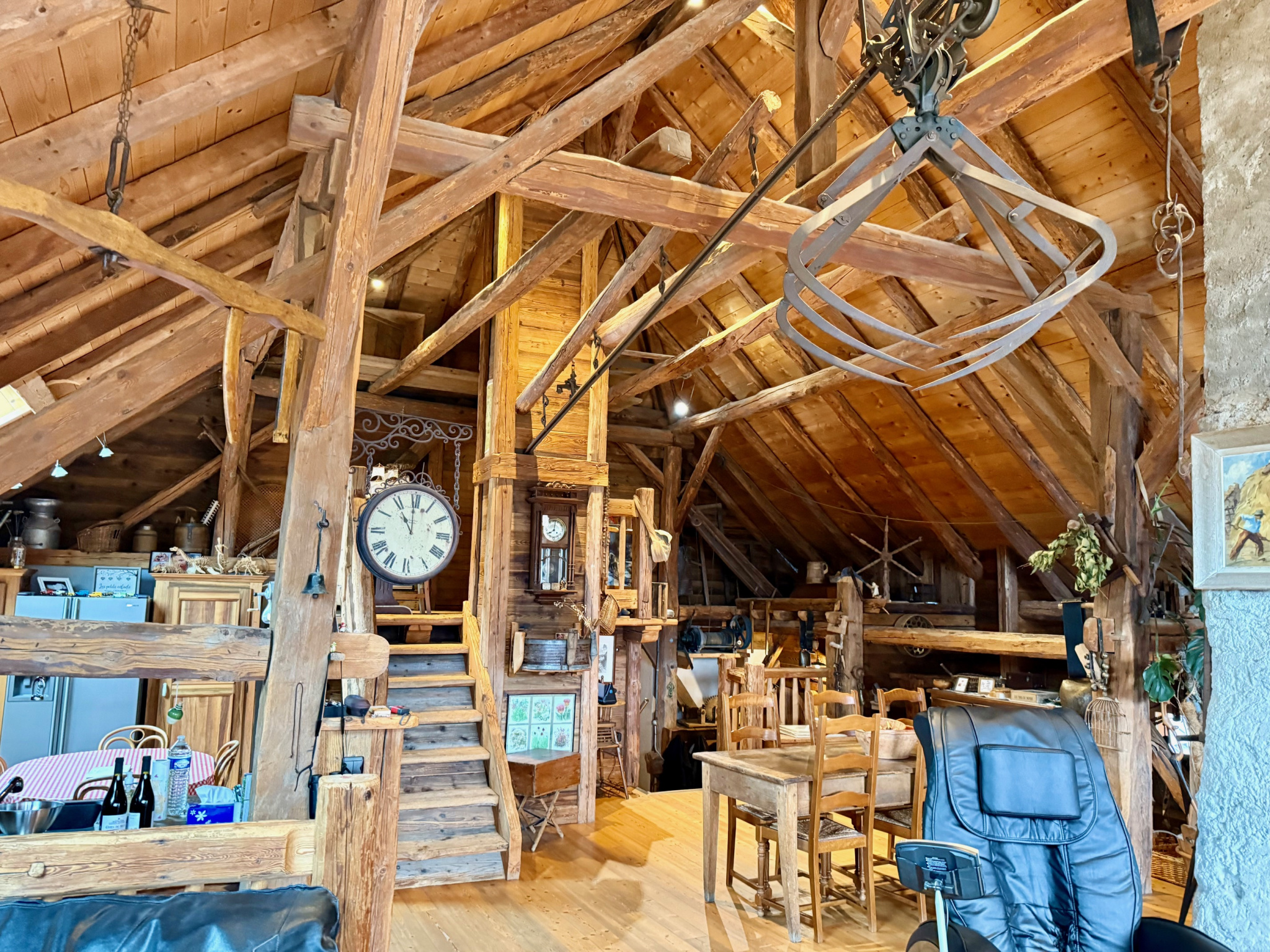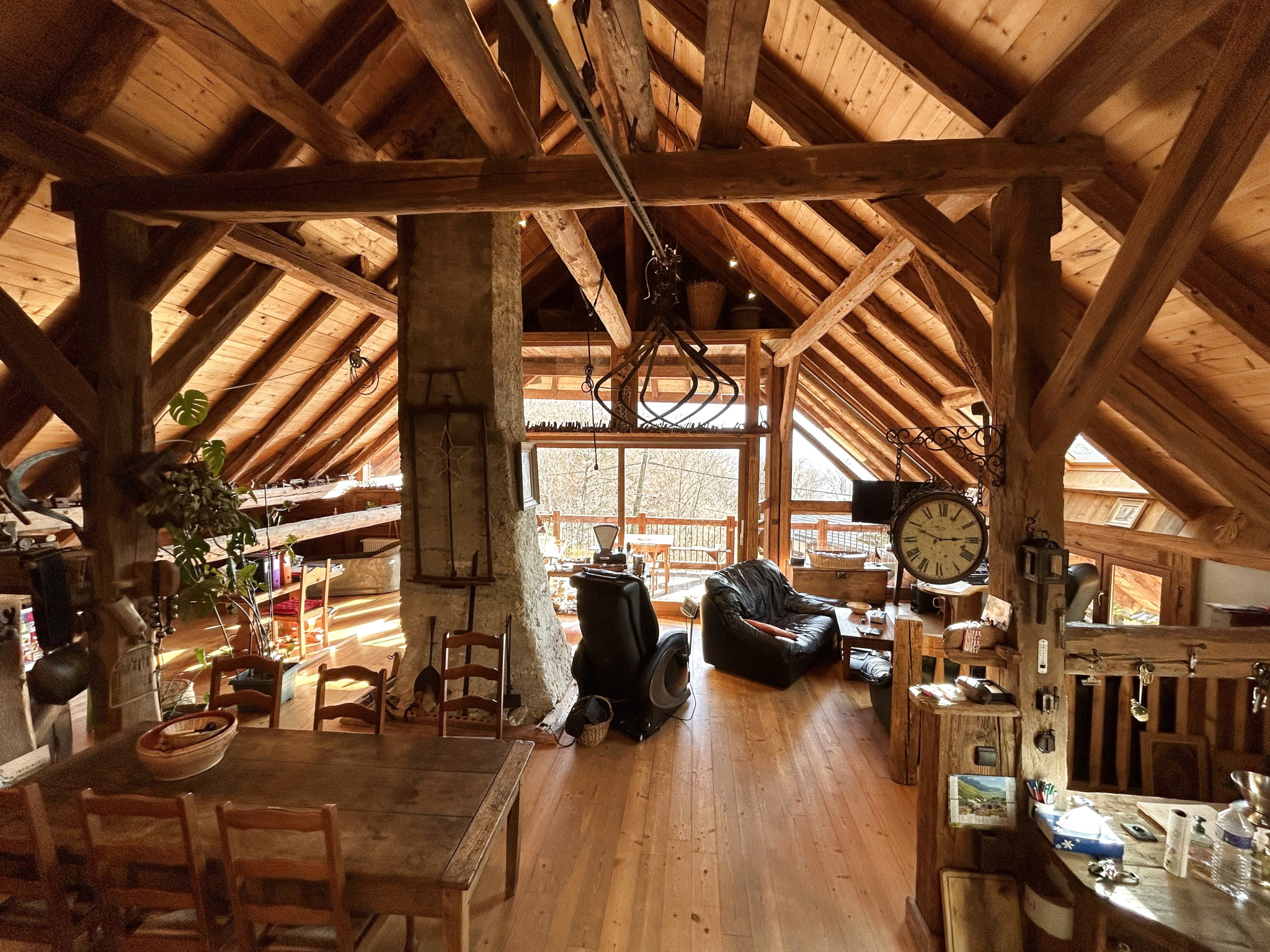 Au deuxième étage : l’habitation principale avec une magnifique pièce de vie d’environ 80 m2, comprenant une cuisine équipée, ouverte sur une terrasse couverte bénéficiant d’une vue dégagée sur la forêt et la vallée. Ce niveau dispose également de deux chambres, d’une salle de bains et d’un WC séparée.