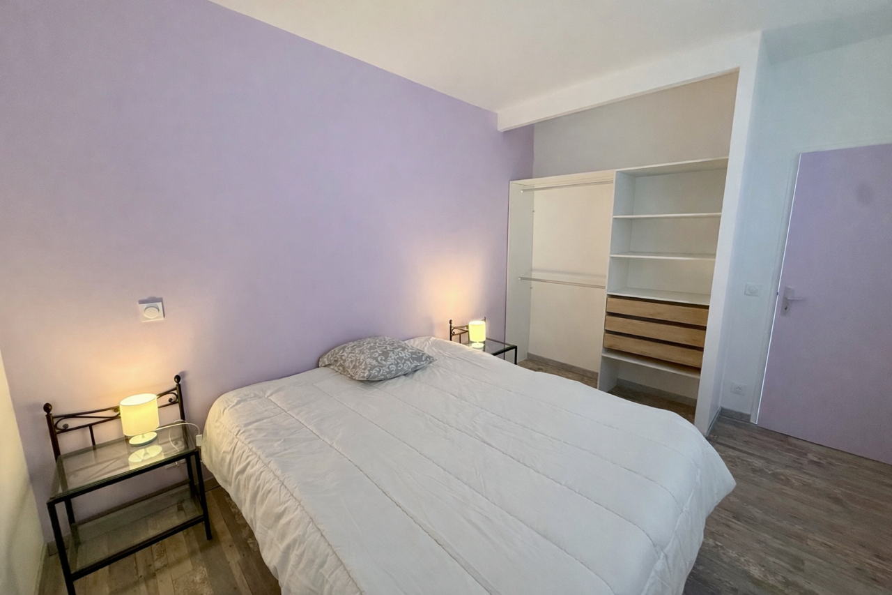 Entrée sur une pièce de vie avec cuisine équipée ouverte sur un coin salon, une chambre avec placard, une salle d’eau et un WC.