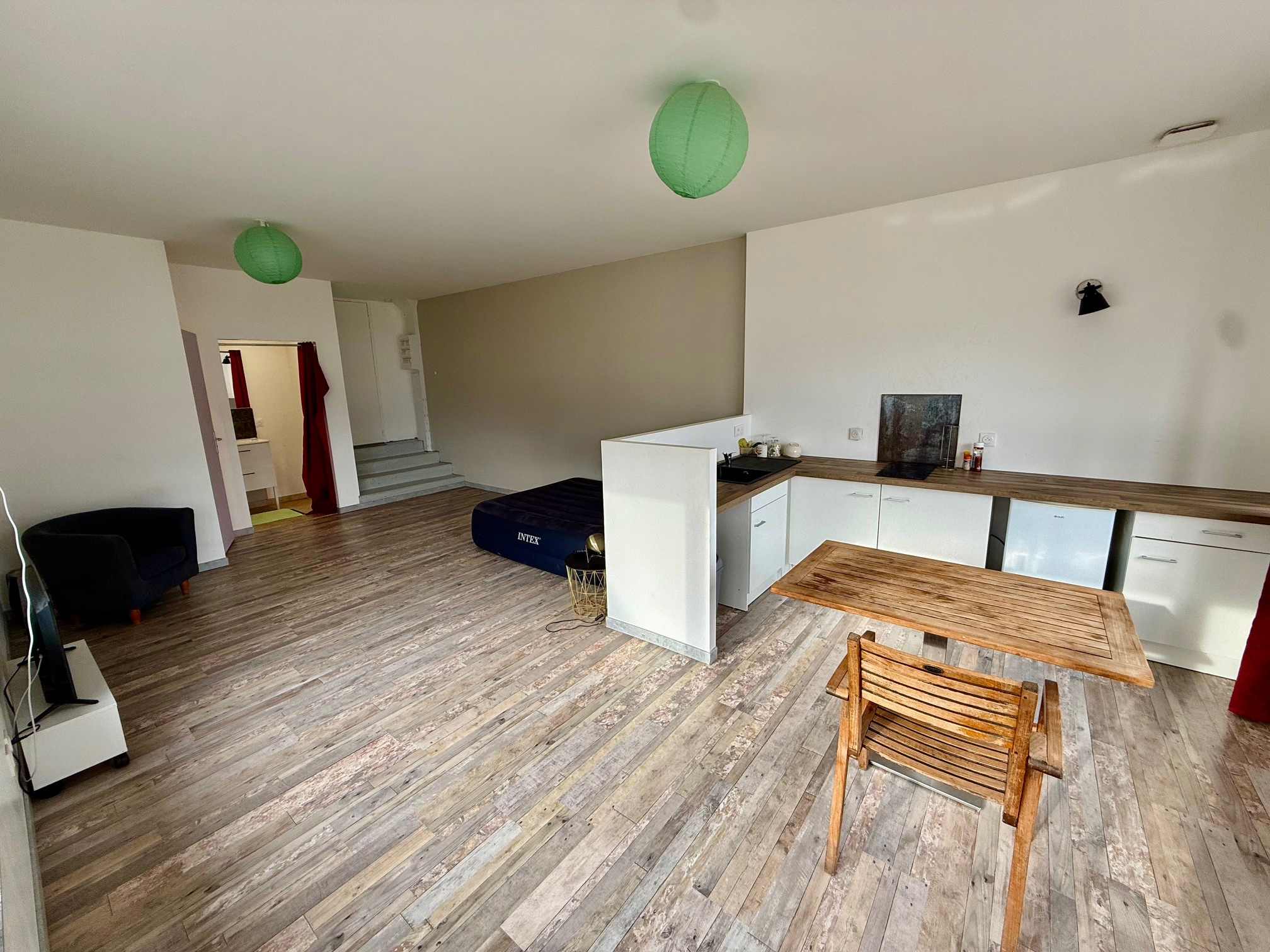Entrée sur une pièce de vie avec un coin cuisine équipée, une salle d’eau et un WC.