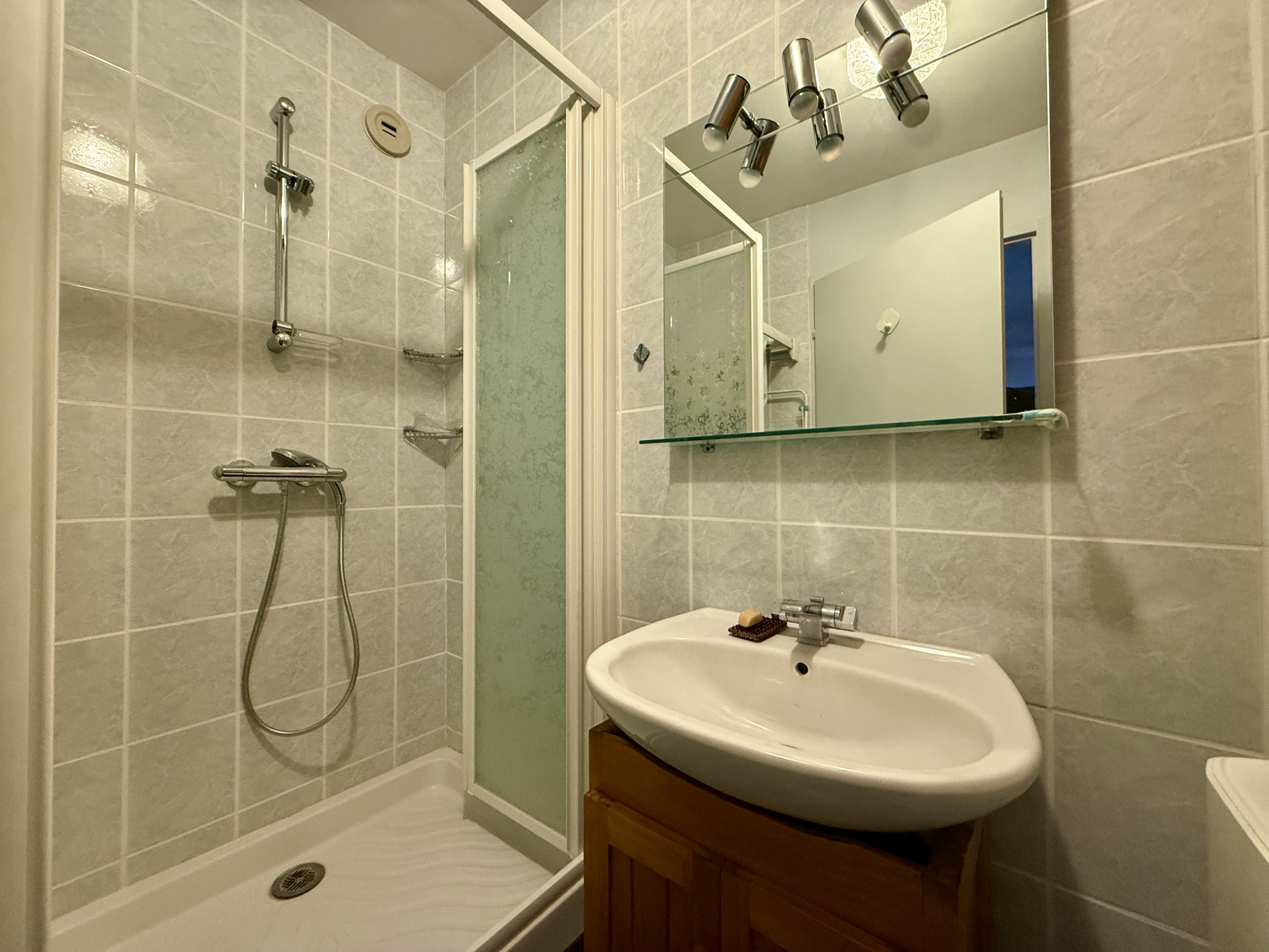 Une entrée avec placards, deux chambres, une salle de bains avec douche, un wc, une cuisine semi ouverte équipée et un accès balcon et salon/séjour.