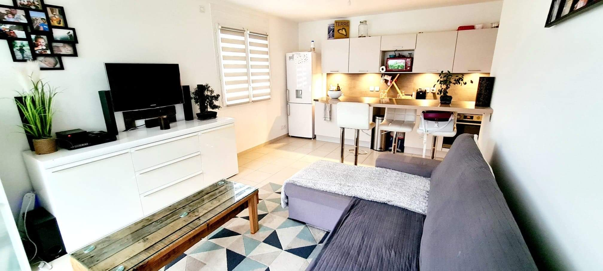 Un hall d'entrée, une salle de bains avec wc, une chambre, cuisine équipée ouverte sur séjour avec terrasse et jardin.